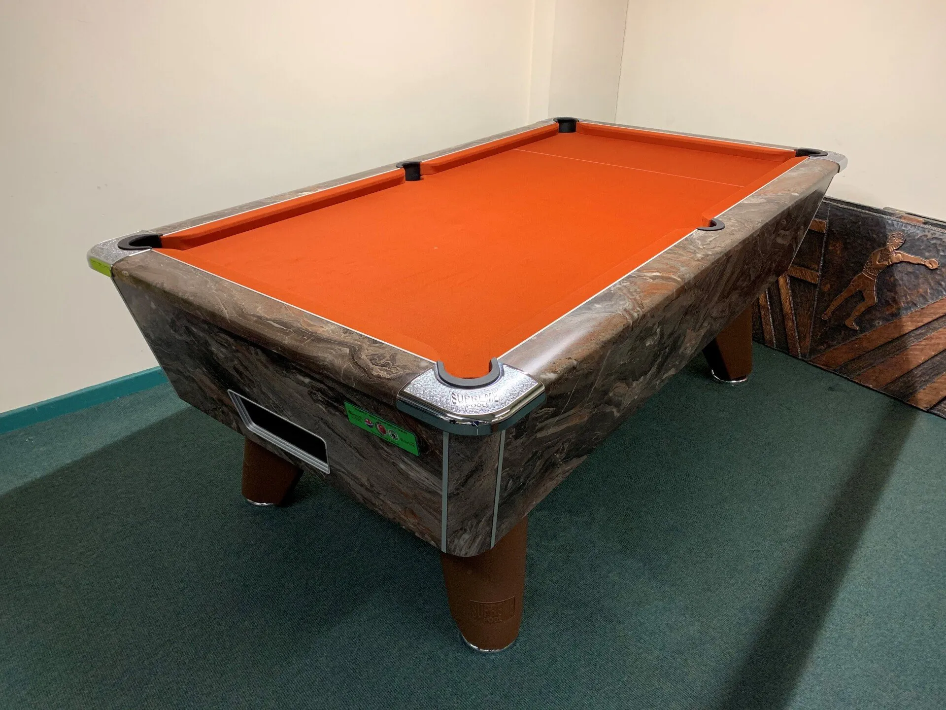 Available in 6’ x 3 ½’ & 7’ x 4’, Copper Marble finish. MDF constructed tapered body, silver aluminium body extrusions, ¾” Italian slate bed covered in Green Strachan 6811 Cloth, solid wood cushions fitted with high response ¾” cushion rubber and competition size pocket openings.